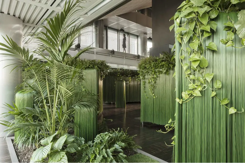 Labirinto, 2020, setole plastiche verdi e piante, struttura metallica a labirinto, installazione ambientale immersiva / green broom bristles and plants, labyrinth metallic structure, immersive environmental installation, CUBO in Torre Unipol, Museo d’impresa del Gruppo Unipol, Bologna. Courtesy FPA Francesca Pasquali Archive. © Fabio Mantovani
