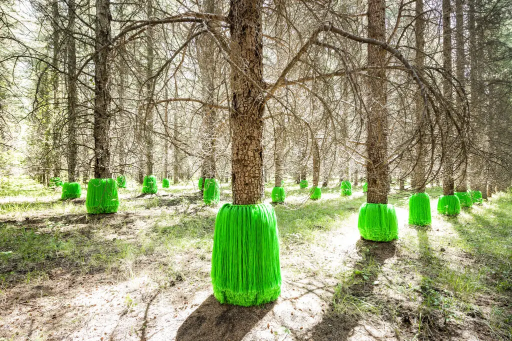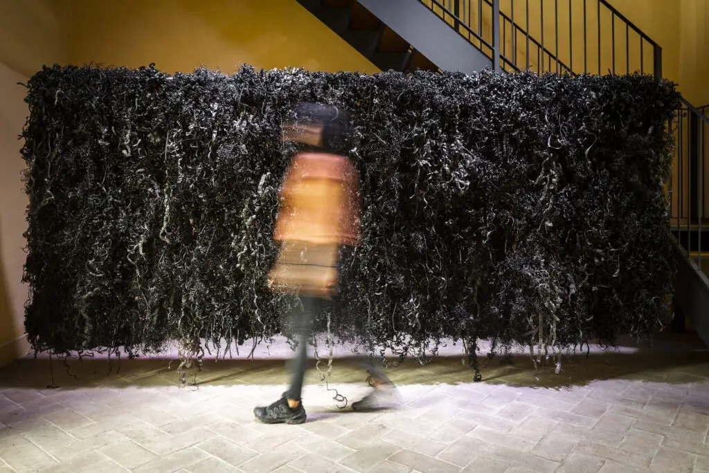 Espandendosi per tutto il piano 25 dell’edificio CUBO, “Labirinto” trasforma lo spazio in una sorta di foresta artificiale composta da morbidi filamenti di setola verde, che vibrano al passaggio dei visitatori, creando un’interazione diretta tra spettatore e opera.