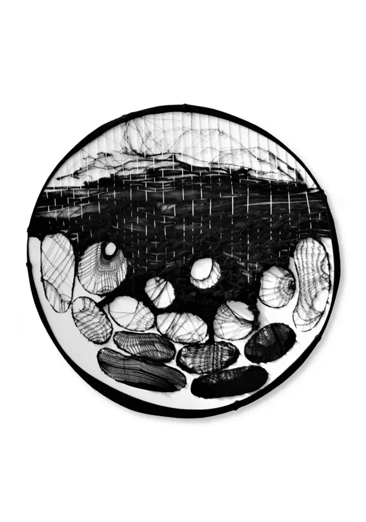 Madre terra, 2019, collant nero e fili di lana, diametro 61 cm. Opera vincitrice della nona edizione del Premio Cramum 2022.